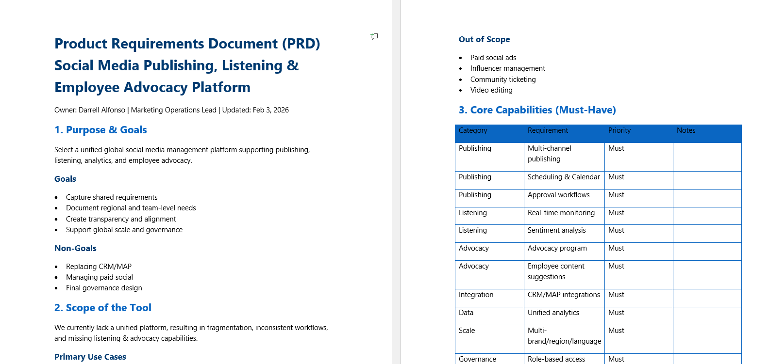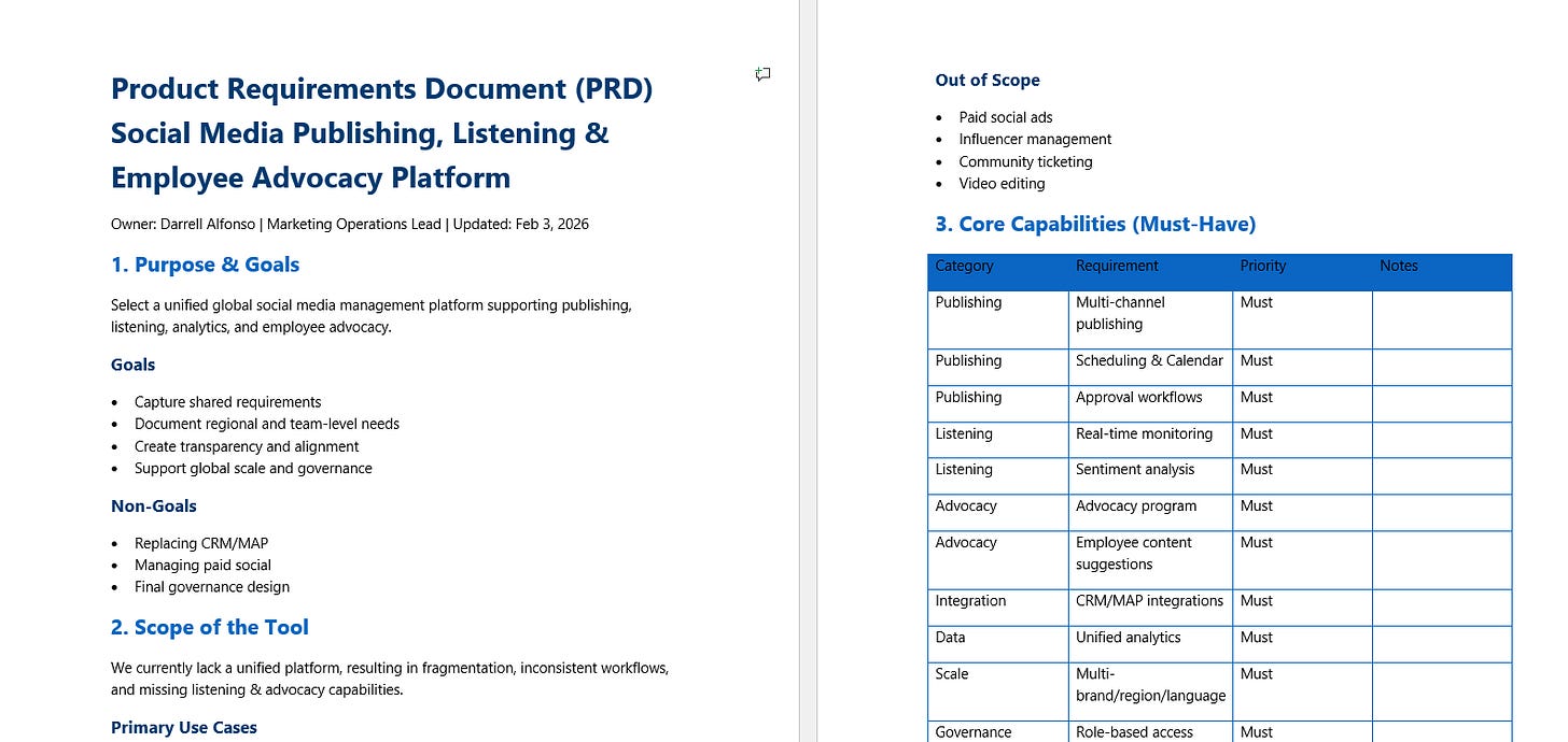 The PRD served as the playbook for vendor evaluation. Regional marketers added localized requirements. Legal and IT flagged compliance risks. Executives saw how we’d evaluate vendors and make the final decision. All in one document.
